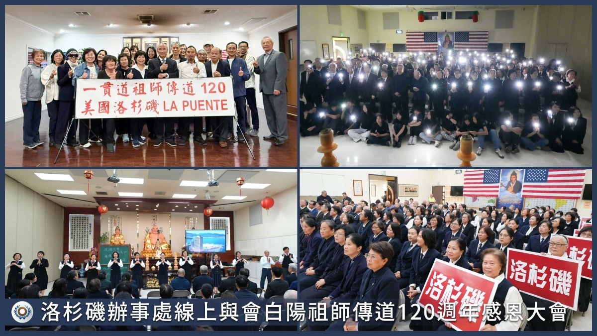 1996年10月,一貫道世界總會在洛杉磯正式成立,成為各組線團結協作的平台。在這座人才薈萃的城市,各組線的前賢同心協力,彼此支援,共同推展道務,使道氣充盈。「洛杉磯乃人才會,各有使命來發揮。提起責任勇力備,盡心盡力修辦追。」這句話道出了道場運作的精神,前人輩無私奉獻,後學則承襲志業,讓道務在此深耕茁壯。活佛恩師慈悲開示:「洛杉磯這個美麗的地方,因為有你們,這才美麗。因為有你們,這份愛才會更大、更光明、更光亮。」此語深植每位道親心中,勉勵眾人不忘初心,凝聚力量,續創輝煌。