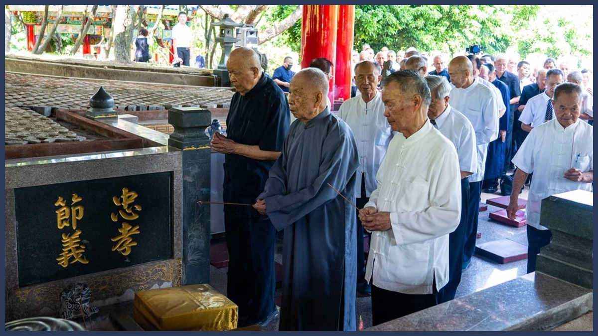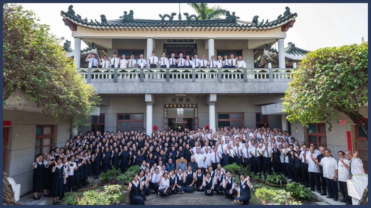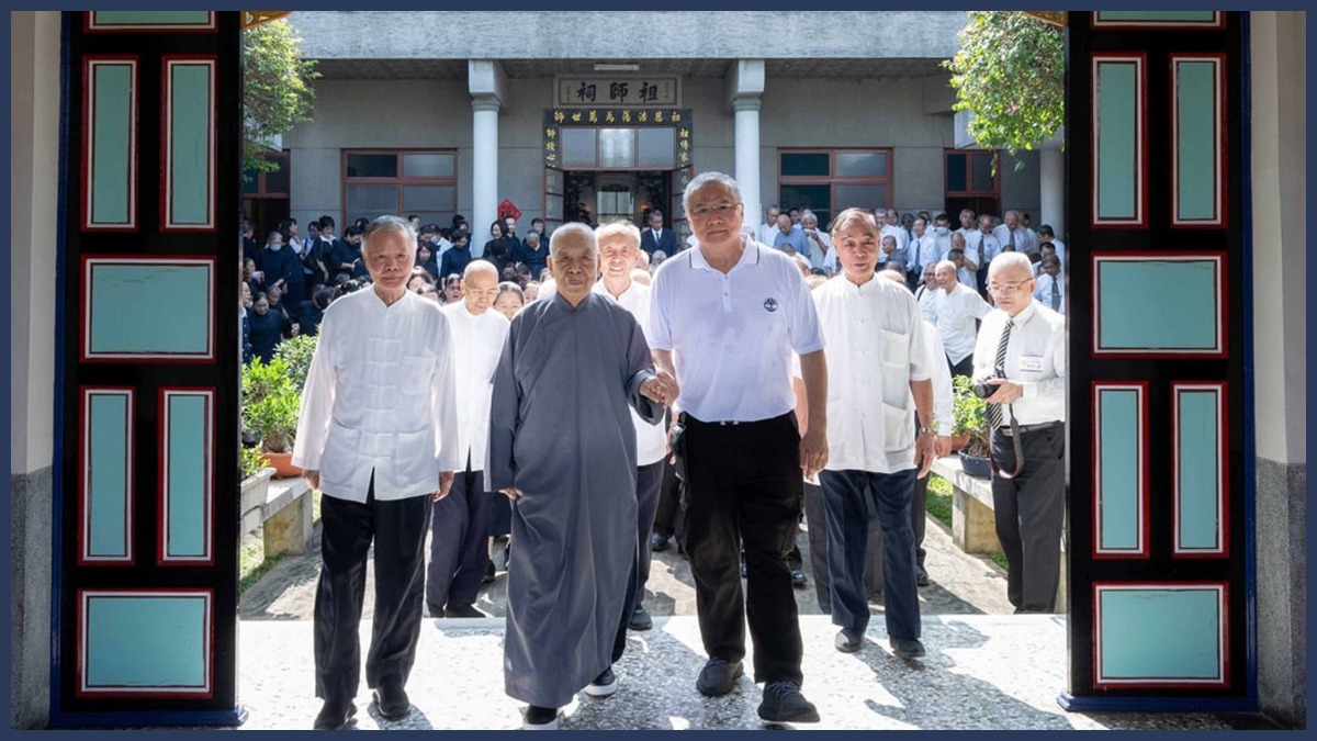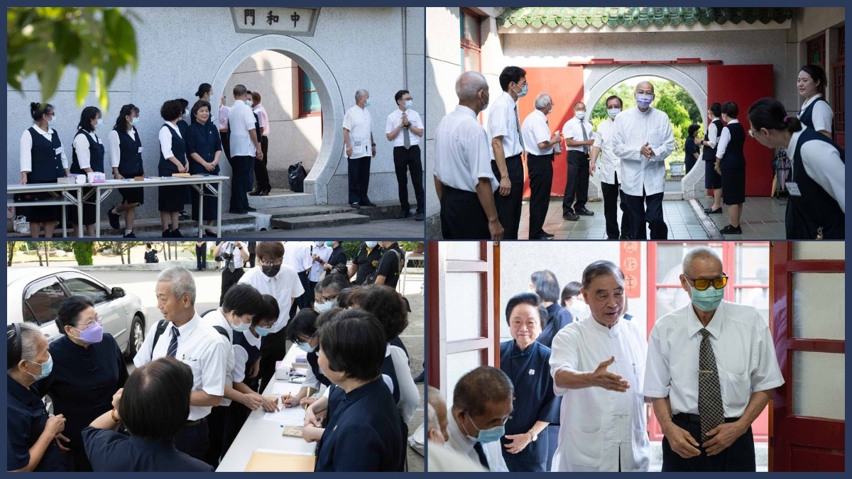 福山祖師祠內,奉天宮前賢早已將供果準備齊全,二樓天元佛殿恭請韓老點傳師慈悲帶動乾道點傳師前賢,恭敬向明明上帝、祖師、師尊、師母獻香叩首。一樓三聖殿恭請顏老點傳師慈悲帶動坤道點傳師前賢,恭敬向白陽三聖神位獻香叩首,在行禮如儀之後,大眾齊聚在四合院中庭大合照,道場的核心價值「敬老尊賢」在相片中展露無遺,大事紀還出動了空拍機,由上帝的視角俯瞰,留下了動態的歷史畫面。