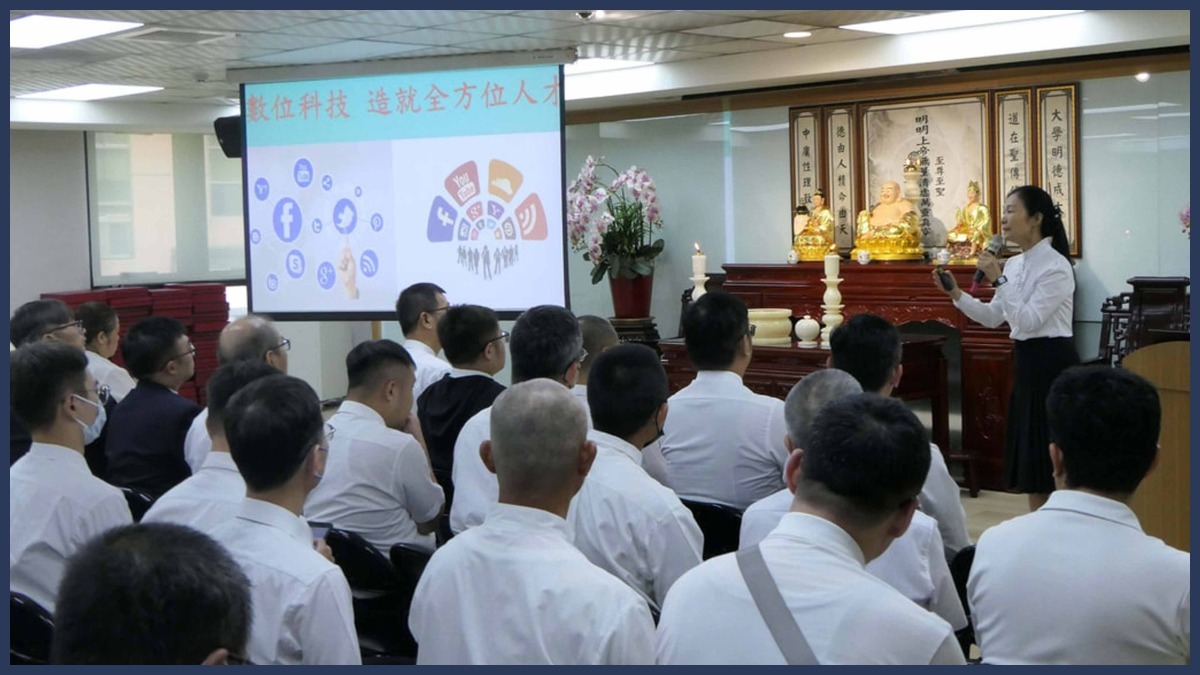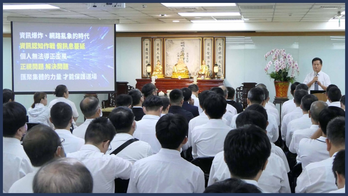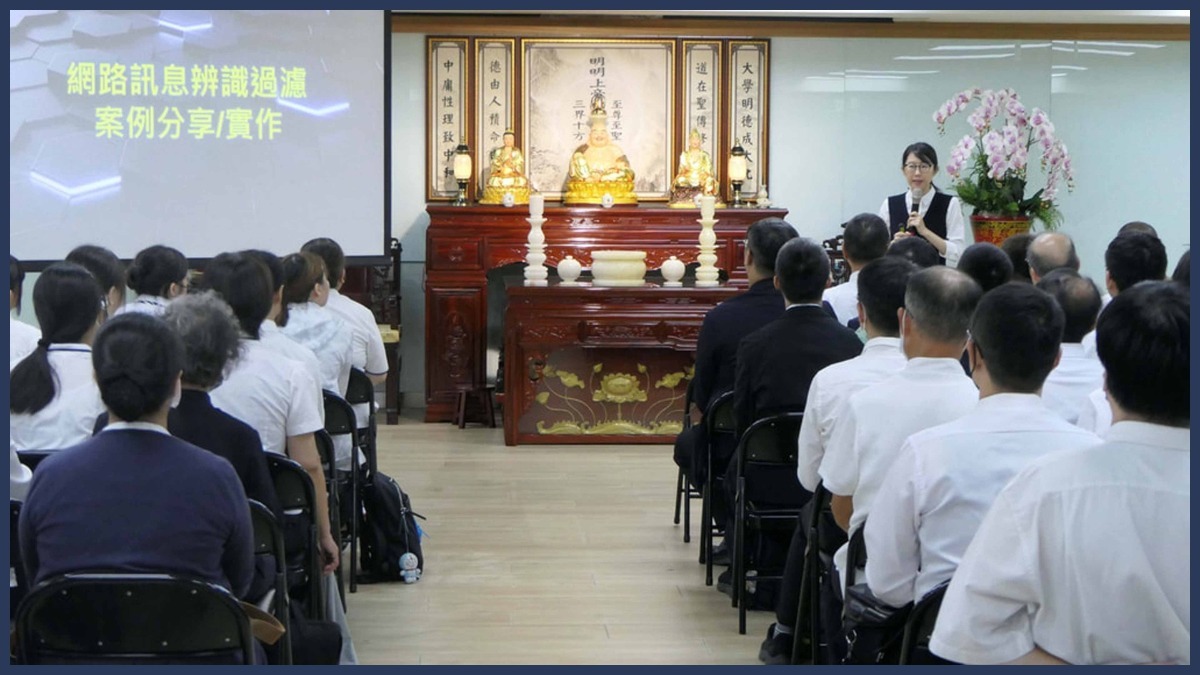 研習活動由黃秘書長操持,「護道影片」播放介紹,正確的網路訊息過濾識別︰面對負面的訊息︰「不要好奇、好事、不要點閱」,透過正面的內容堆疊產生積極的影響力,讓負面的訊息在這樣的正向環境中被掩蓋,沉在大海裡,在訊息超載的世界中更有效地來保護自己、保護家人、保護道場。