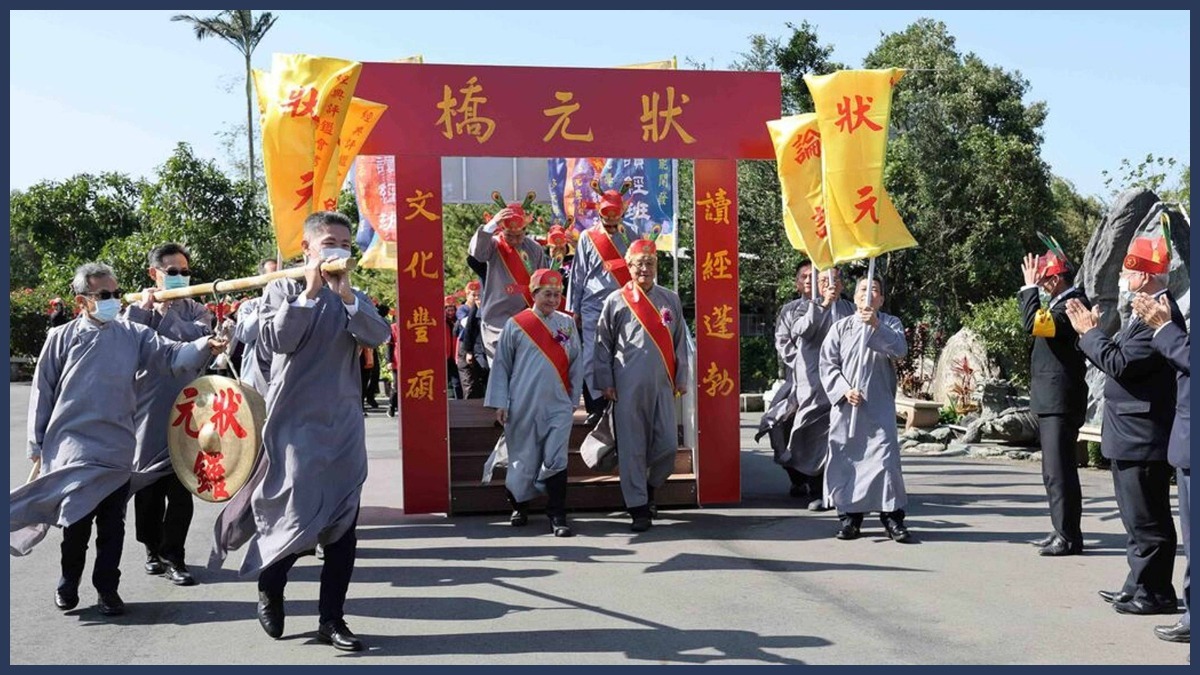 古人云:「天不生仲尼,萬古如長夜」。新科狀元在莊嚴隆重的獻供儀式後,敬拜感恩至聖先師開啟了平民教育,教導人生走向五倫八德,光明智慧的崇高精神。全體狀元井然有序聚集廣場,由點傳師群慈悲帶領游泮過狀元橋,鑼鼓喧天響,鑼音震天高,旗牌官高舉旗牌,威風凜凜過狀元橋,大眾掌聲響起,餘音繚繞。最後進行大合照,全體高唱禮運大同篇,此時,天空泛起祥雲朵朵,群鳥飛翔。
