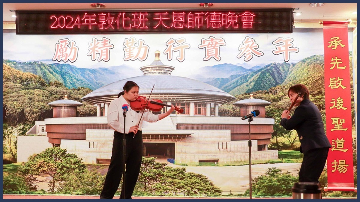 晚會中,第十七屆一貫人才專修苑學生林于晶前賢與女兒,以曲笛與中提琴帶來「感恩的心」演奏;善曲傳遞真理,眾人一同吟唱「老母的佛兒」,讓天恩浩瀚與師德巍巍喚醒沉睡的心靈,砥勵愿行,以報天恩師德。